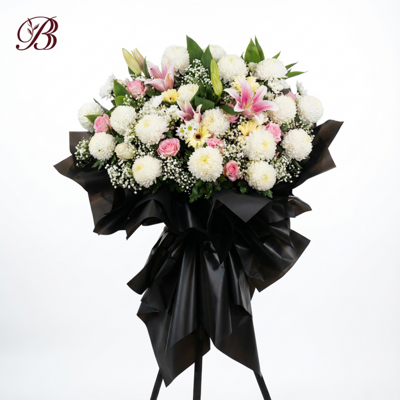 This distinguished condolence flower stand is composed entirely of white blooms, symbolizing purity, peace, and everlasting remembrance. The arrangement features white roses, white paper mums, white mattiola, and white daisies. The uniform use of white flowers reflects solemnity and reverence, making it a respectful and elegant tribute for expressing condolences and sympathy during times of loss.