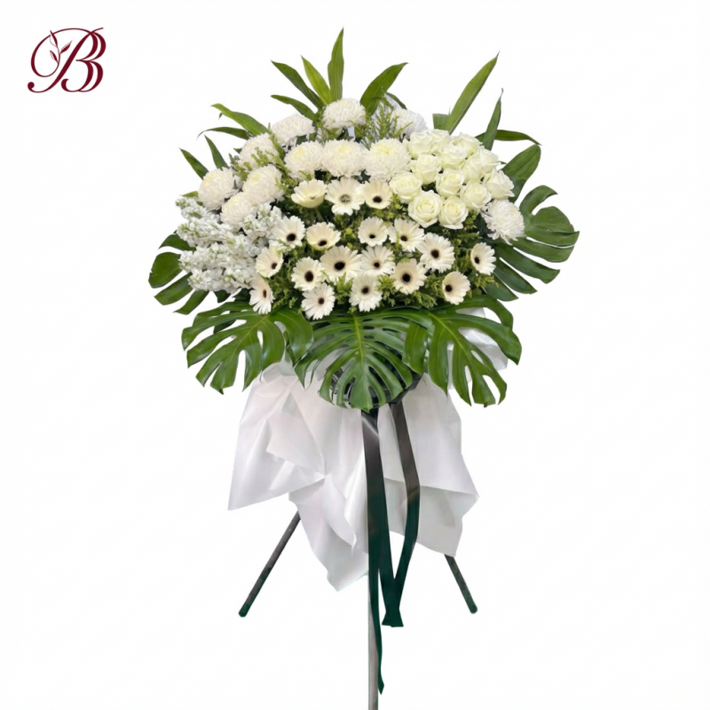 This graceful condolence flower stand is a meaningful tribute, beautifully arranged with a harmonious blend of colors and blooms. Bright yellow daisies symbolize friendship, hope, and remembrance, bringing a touch of warmth and comfort. Pure white daisies and white ping pong flowers represent innocence and peace, offering a calming presence. Elegant white roses add a touch of timeless beauty, love, and reverence. The arrangement is beautifully finished to create a serene and respectful display, conveying heartfelt sympathy, love, and support during a time of loss.