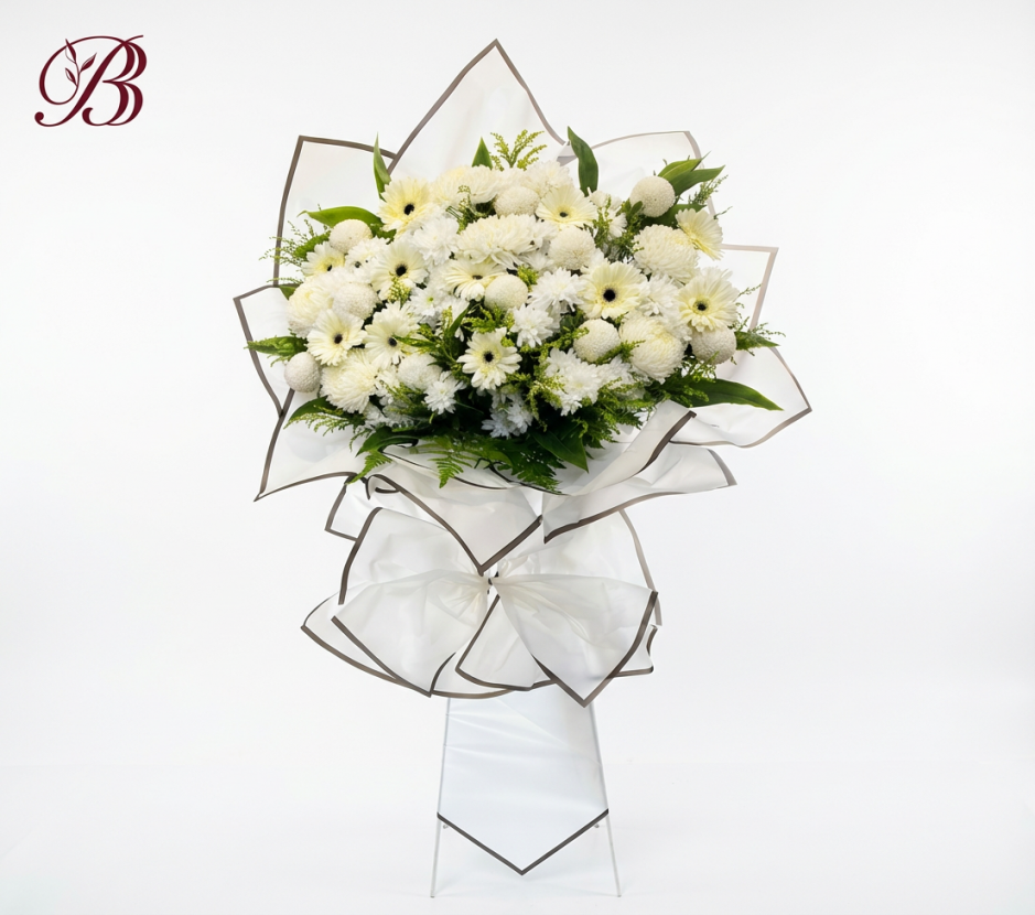 This distinguished condolence flower stand is composed entirely with white blooms, symbolizing purity, peace, and everlasting remembrance. The arrangement features white daisies, white chrysanthemum, white paper mum and white ping pong. The uniform use of white flowers reflects solemnity and reverence, making it a respectful and elegant tribute for expressing condolences and sympathy during times of loss.